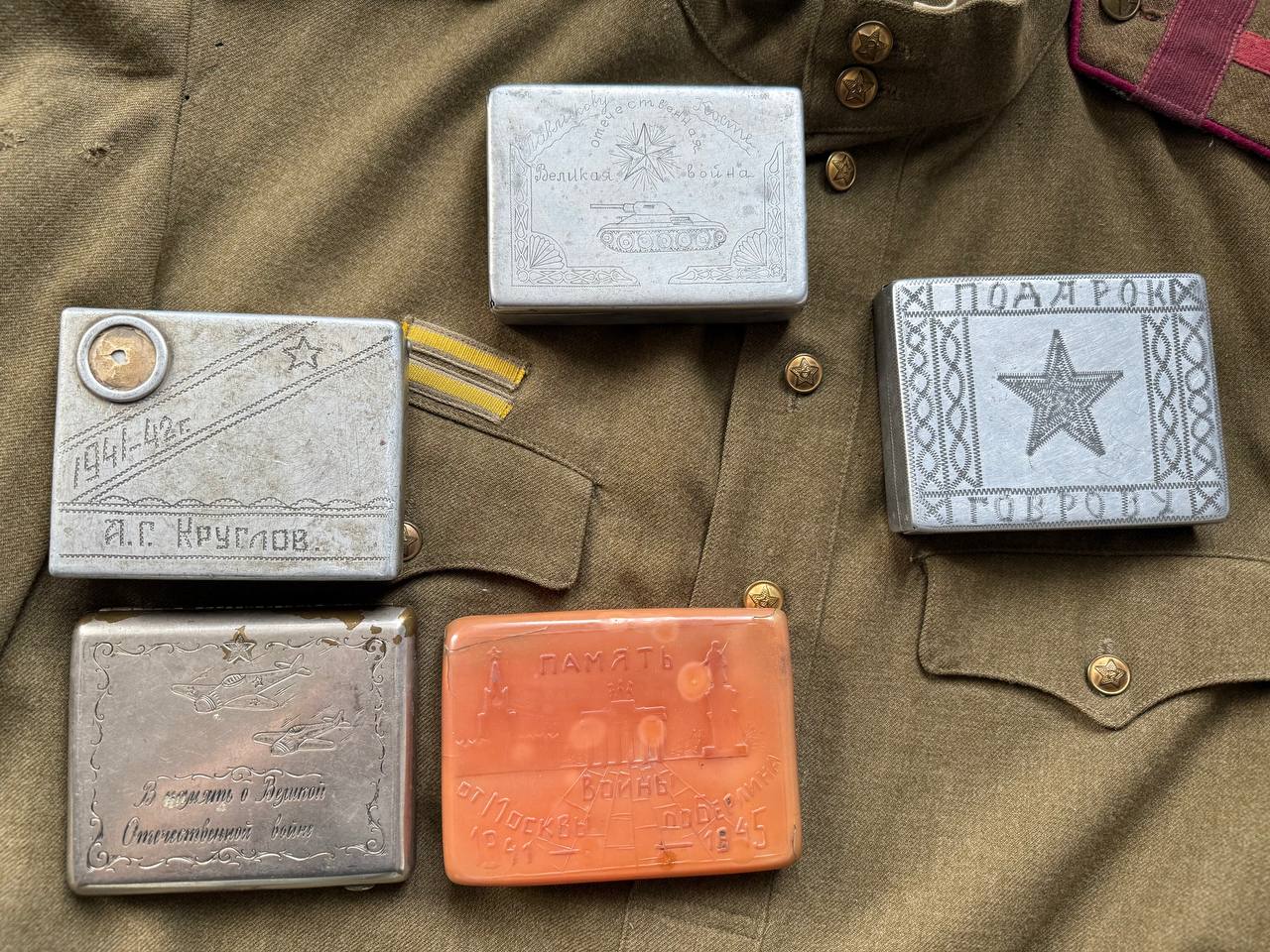 Часто, помимо портсигаров, можно встретить подарочные шкатулки, финки, зажигалки и мундштуки. Для генералитета шкатулки делались из карболита, плексигласа, дюралюминия. В редчайших случаях – из серебра. Часто, в качестве основы, использовали трофейные шкатулки или портсигары, а затем дополняли все своими деталями, сделанными вручную, штихельными надписями и всевозможными орнаментами. В ряде музеев подобные экспонаты выставлены в экспозициях. Я встречал такие шедевры в минском музее и музее Советской армии в Москве. Шедевр, не меньше! Каждая работа выполнялась индивидуально и делалась на заказ под определенного воина, будь то солдат, офицер или генерал.